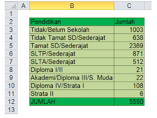 Tampilannya akan terlihat seperti ini : - Untuk mengetahui jumlah penduduk perjenjang pendidikan silahkan klik pada sel C3 dan ketikan formula di bawah ini : =COUNTIF(Database!$L$2:$L$5551;Pendidikan!B3) Jika di enter akan muncul jumlah penduduk Tidak/Belum Sekolah Untuk menghitung jenjang penddikan yang lainnya, tinggal copy sel C3 dan paste pada sel C4 sampai dengan C11. Jika penulisan rumusnya benar hasilnya akan muncul otomatis